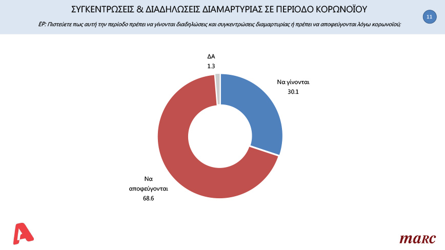 Πρέπει ή όχι να γίνονται διαδηλώσεις και συγκεντρώσεις διαμαρτυρίας εν μέσω πανδημίας; Το 30,1% των πολιτών απάντησε «ναι να γίνονται» και το 68,6% «να αποφεύγονται».