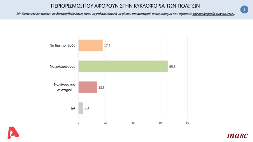 Σε ποσοστό 65,5% οι πολίτες απάντησαν πως πρέπει να χαλαρώσουν, σε αντίθεση με το 17,7% που απάντησε να διατηρηθούν ενώ το 13,5% θέλουν πιο αυστηρά μέτρα.