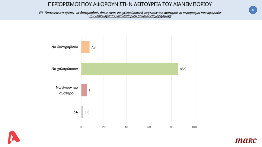 Σε ότι αφορά τους περιορισμούς που αφορούν τη λειτουργία του λιανεμπορίου, το 85,9% επιθυμεί να χαλαρώσουν τα μέτρα.
