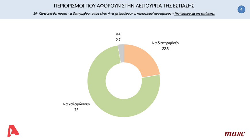 Το 75% των ερωτηθέντων επιθυμεί να χαλαρώσουν και οι περιορισμοί που αφορούν στην λειτουργία της εστίασης.