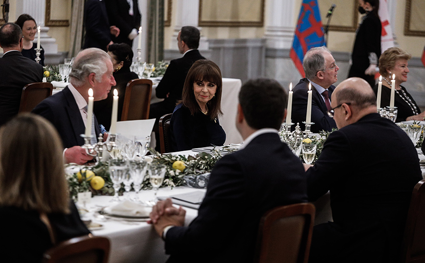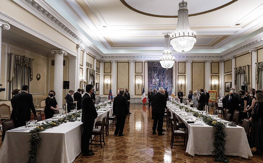 Στη συνέχεια παραβρέθηκαν στο Προεδρικό Μέγαρο για το επίσημο δείπνο, το οποίο ξεκίνησε ακριβώς στις 20:30, με την ανάκρουση του Εθνικού Ύμνου, ενώ αμέσως μετά ξεκίνησε την ομιλία της η Πρόεδρος της Δημοκρατίας, Κατερίνα Σακελλαροπούλου.