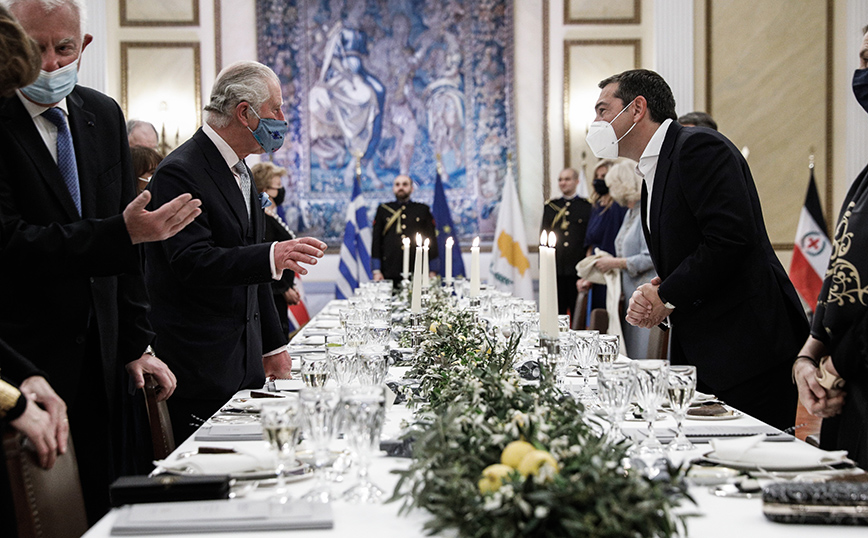 Στην αντιφώνησή του κατά τη διάρκεια του δείπνου, ο πρίγκιπας της Ουαλίας έκλεισε τον λόγο του με στίχους από τον Εθνικό Ύμνο, λέγοντας συγκεκριμένα «με αυτό το πνεύμα, αύριο, οι Βρετανοί φίλοι σας θα σταθούμε δίπλα σας για άλλη μια φορά και θα αισθανθούμε μεγάλη υπερηφάνεια με την αφυπνιστική προτροπή του Διονύσιου Σολωμού: Χαίρε, ω χαίρε, ελευθεριά! Ζήτω η Ελλάς!».