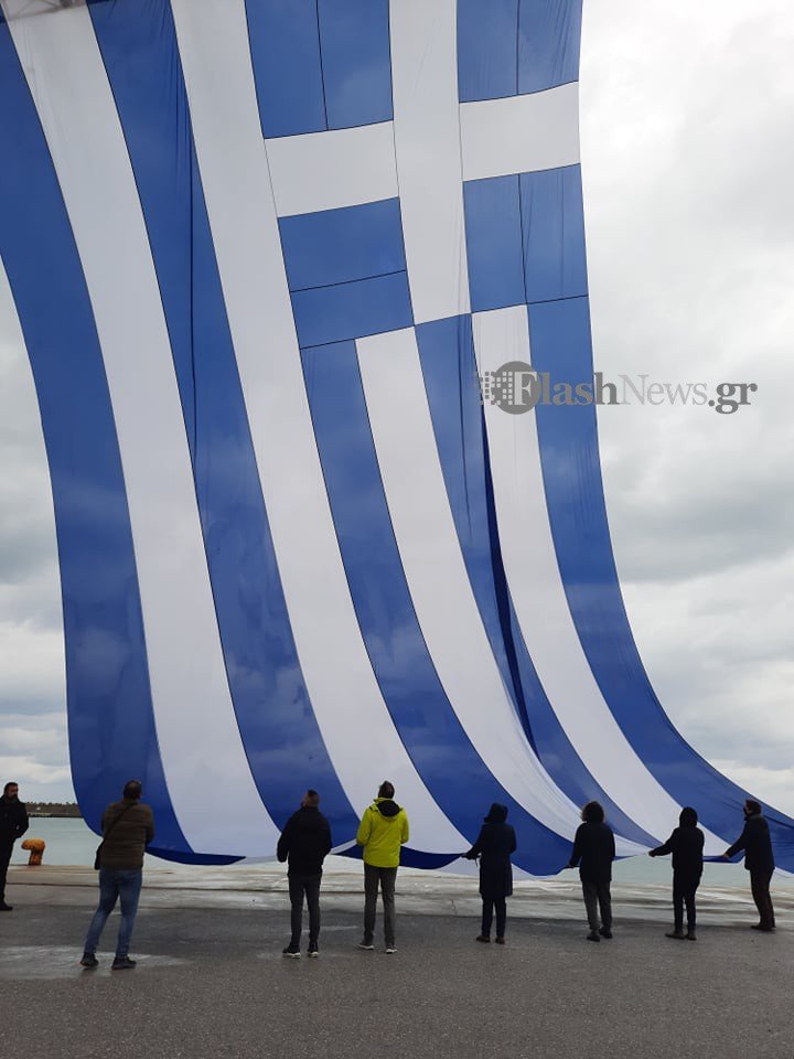 Μια τεράστια ελληνική σημαία κυματίζει από το πρωί στον ουρανό του Ρεθύμνου.