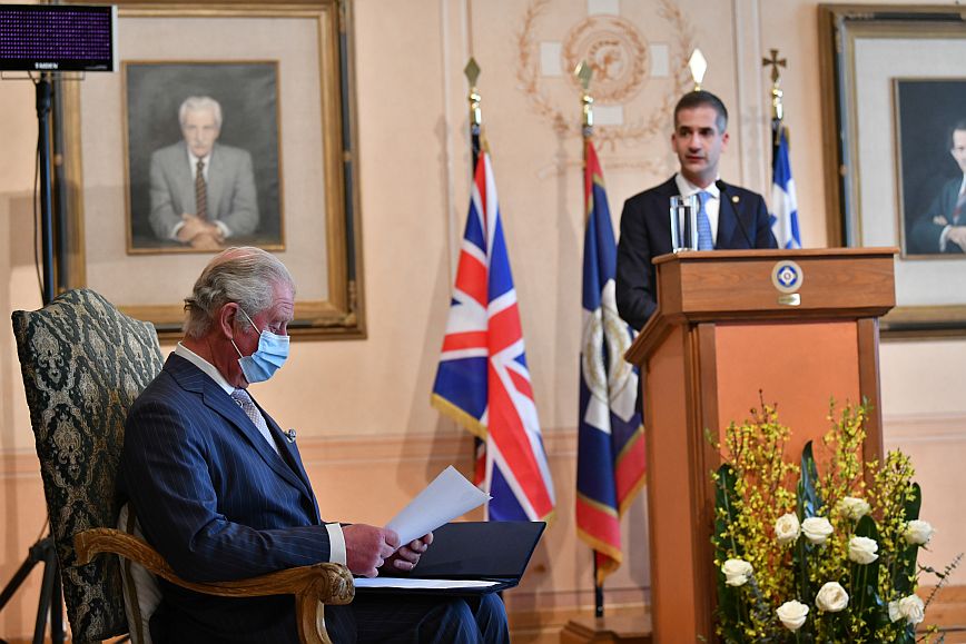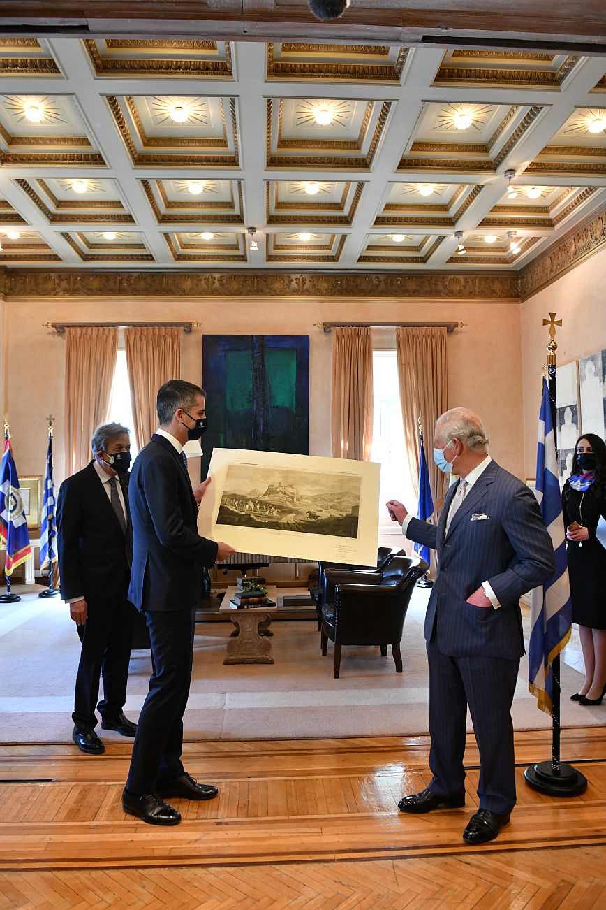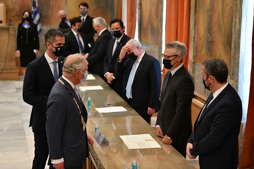 Ο κ. Μπακογιάννης αφού ευχαρίστησε τον πρίγκηπα Κάρολο για τη βοήθεια της χώρας του προς την Ελλάδα έδωσε έμφαση στον αγώνα του λόρδου Βύρωνα που έχασε τη ζωή του στο Μεσολόγγι.
