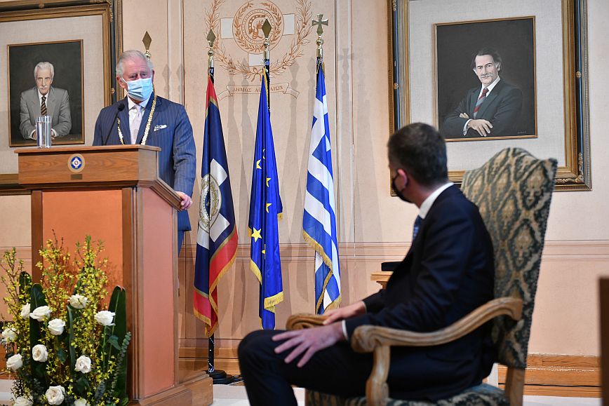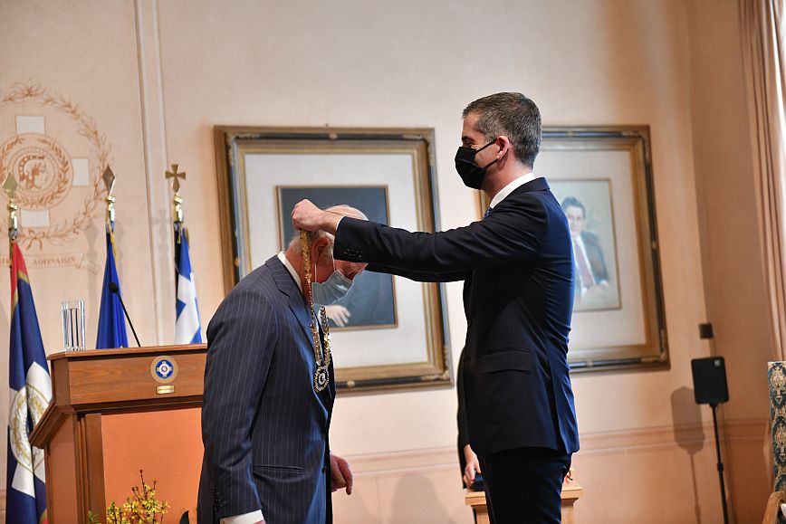 Βαθιά συγκινημένος δήλωσε ο πρίγκιπας της Ουαλίας Κάρολος κατά τη διάρκεια της απονομής από τον δήμαρχο Αθηναίων Κώστα Μπακογιάννη του χρυσού μεταλλίου αξίας της Πόλεως των Αθηνών.
