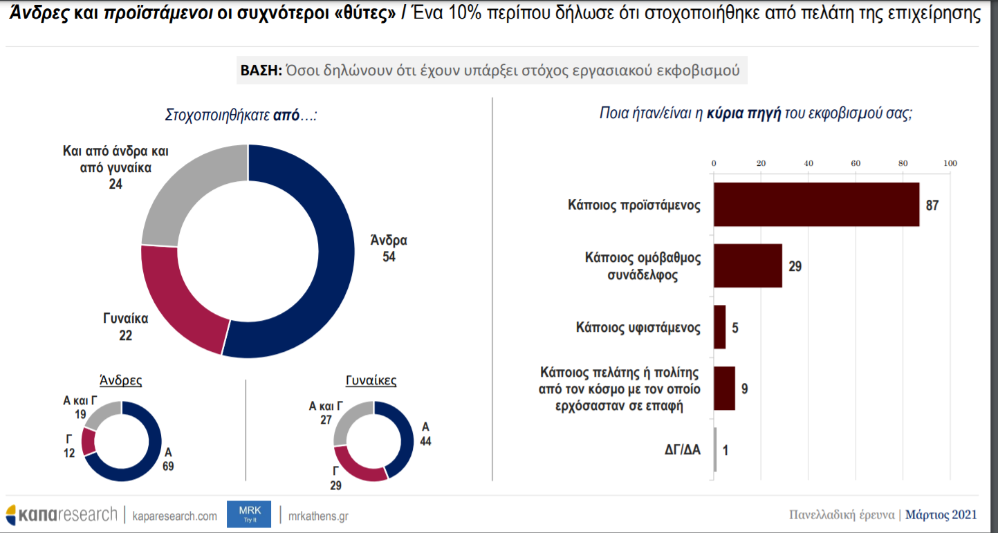 Επιπλέον, ανάμεσα σε αυτό το 38%, ένα στα πέντε θύματα-στόχοι εκφοβισμού (21%) δηλώνει ότι, σήμερα, βρίσκεται σε εξέλιξη η συστηματική εκφοβιστική συμπεριφορά εις βάρος του. Τη συνολική εικόνα συμπληρώνει ένα 8% που δηλώνει ότι κατά το παρελθόν έχει υπάρξει θύτης, έστω και αν σήμερα έχει μετανιώσει για εκείνη τη συμπεριφορά του προς τον/ την συνάδελφο. Είναι, επίσης, πολύ σημαντικό να τονιστεί ότι οι θύτες, συχνά, δεν δρουν μόνοι, αλλά υποστηρίζονται από ομάδα συναδέλφων (43% των περιπτώσεων). Αυτό δικαιολογεί και το γεγονός γιατί σε πολλές περιπτώσεις αυτός που έχει στοχοποιηθεί εγκλωβίζεται μέσα στο περιβάλλον της εργασίας του.