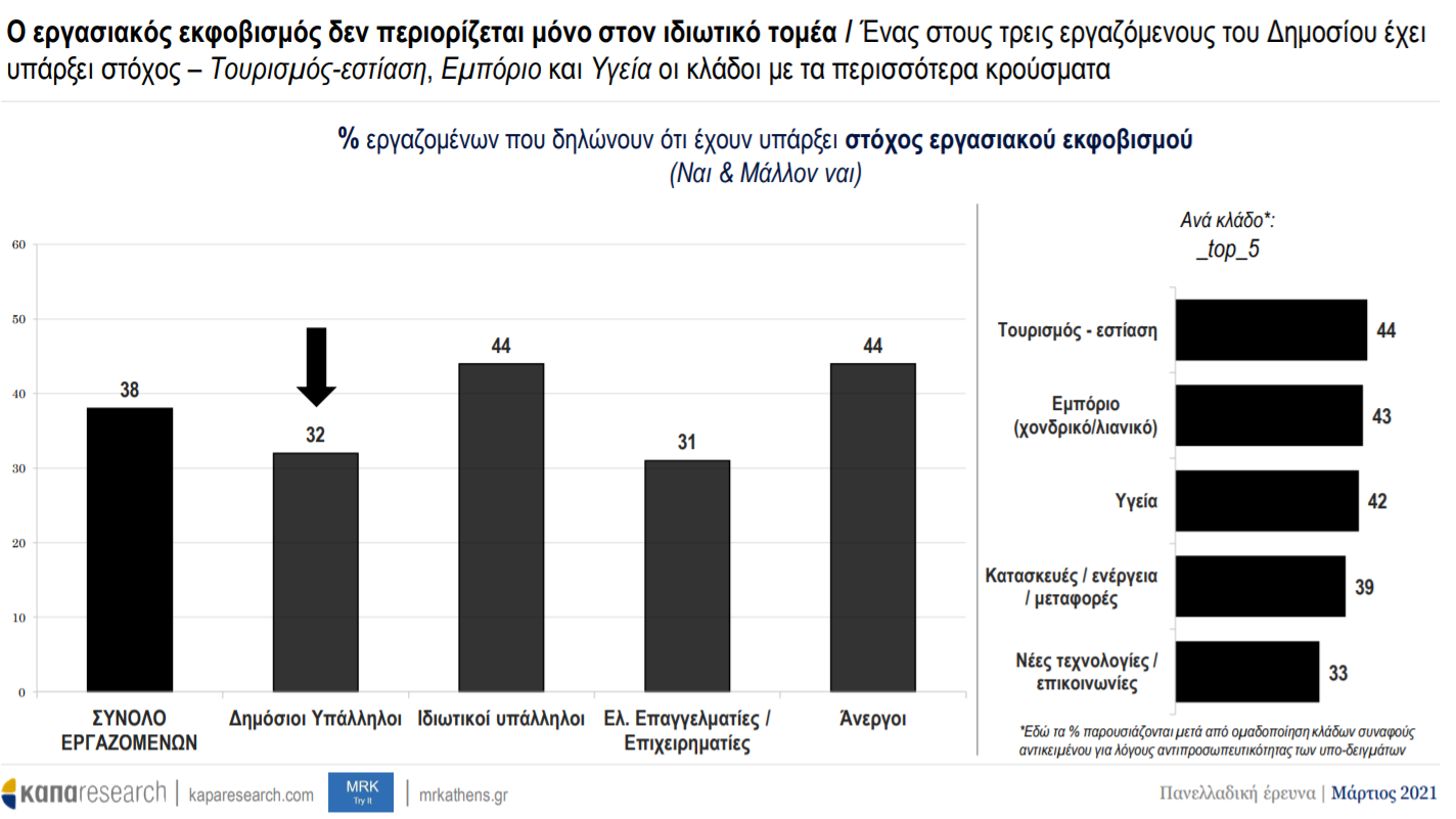 Ο δημόσιος τομέας όπως αποκαλύπτεται στην έρευνα: παρουσιάζει και εκείνος υψηλά επίπεδα εργασιακού εκφοβισμού (32%) σε σχέση με το (44%) του ιδιωτικού τομέα.