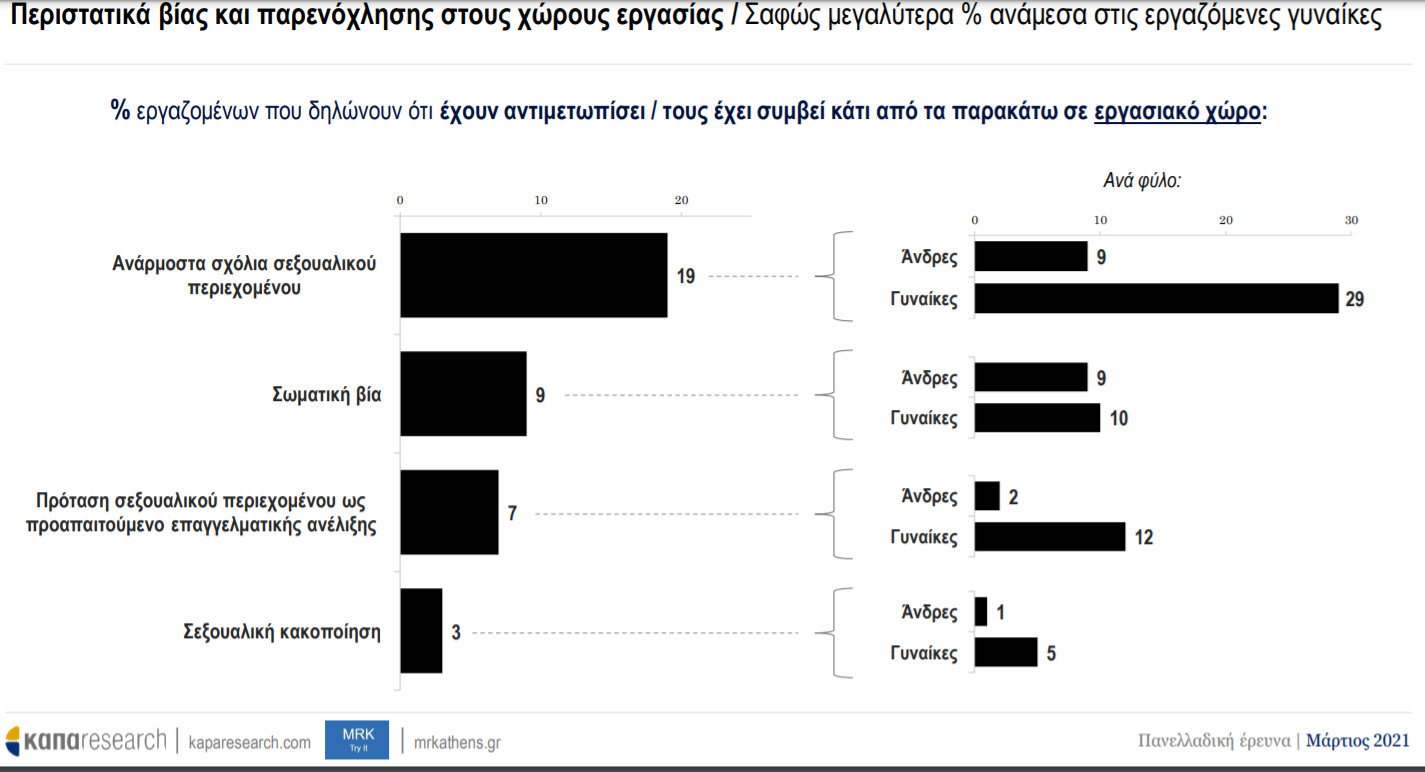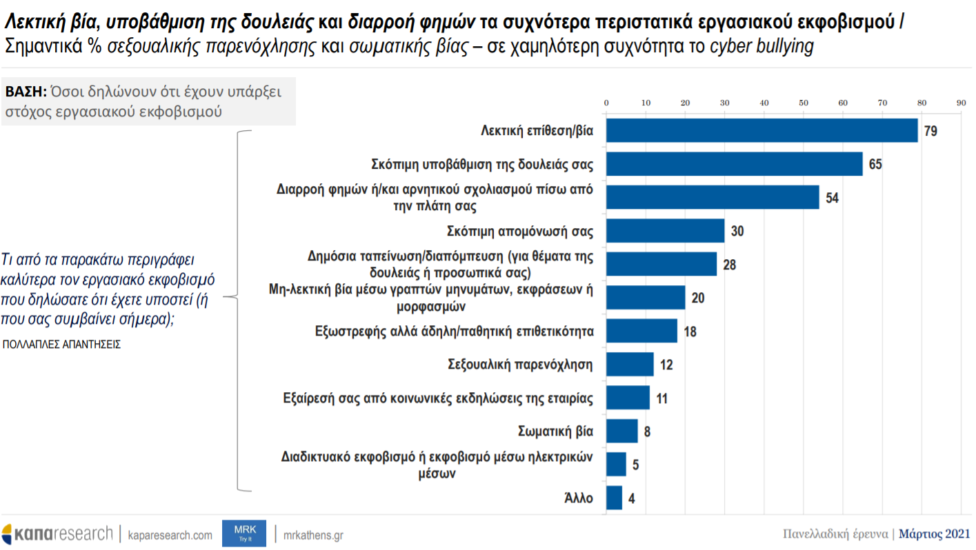 Όσοι έχουν υπάρξει στόχοι έχουν υποστεί, κυρίως λεκτική επίθεση/βία (79%), σκόπιμη υποβάθμιση της δουλειάς τους (65%) και διαρροή φημών ή/και αρνητικού σχολιασμού πίσω από την πλάτη τους (54%). Έχουν υποστεί, ακόμη, σκόπιμη απομόνωση (30%), δημόσια ταπείνωση/διαπόμπευση (για θέματα της δουλειάς ή τα προσωπικά τους (28%), μη-λεκτική βία μέσω γραπτών μηνυμάτων, εκφράσεων ή μορφασμών(20%), εξωστρεφή αλλά άδηλη/παθητική επιθετικότητα (18%), σεξουαλική παρενόχληση (12%), εξαίρεση από κοινωνικές εκδηλώσεις της εταιρίας (11%), σωματική βία (8%), διαδικτυακό εκφοβισμό ή εκφοβισμό μέσω ηλεκτρικών μέσων(5%).