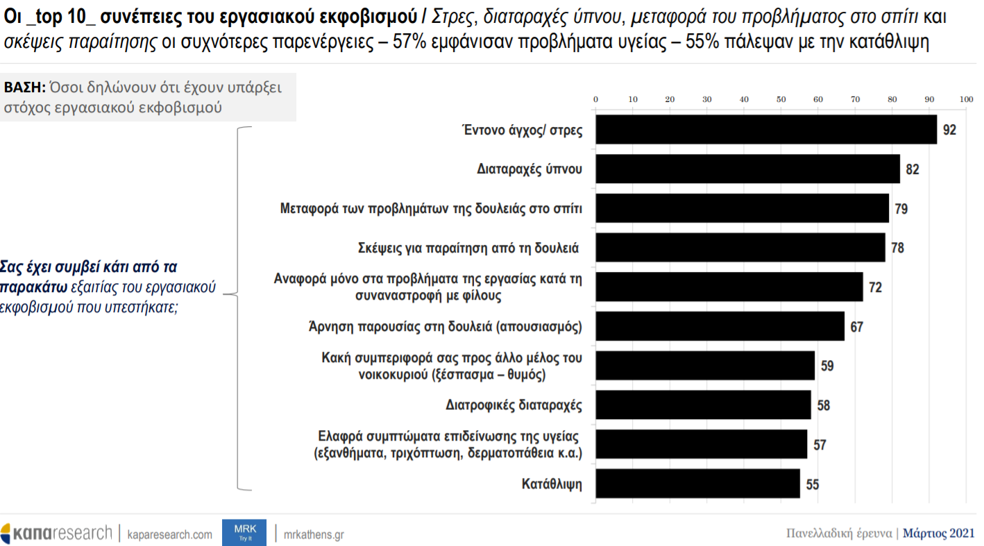 Ο εργασιακός εκφοβισμός μετακινήθηκε και στο πεδίο της τηλεργασίας, όπου το (38%) δηλώνει πως του επιμηκύνετε σκόπιμα το ωράριο εργασίας και για το (25%) θεωρεί ο προϊστάμενος του ότι τεμπελιάζουν επειδή δουλεύουν από το σπίτι. Για το λόγο αυτό το (58%) δηλώνει πως η εργασία του επιδρά αρνητικά την ψυχική υγεία του.
