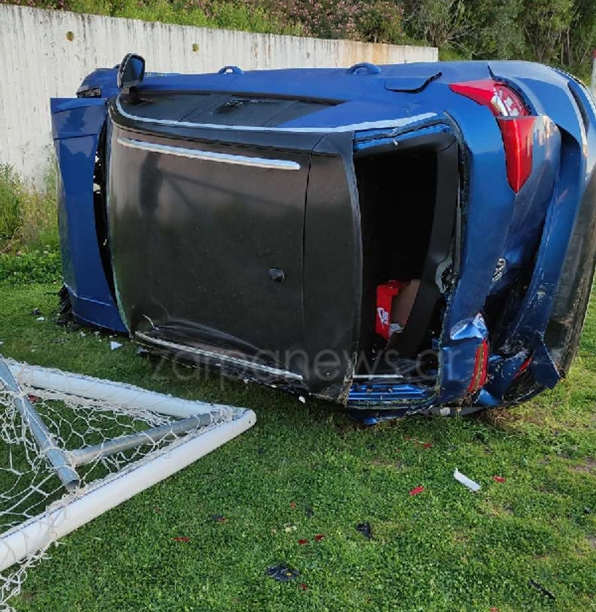 Το ατύχημα έγινε την Κυριακή και όπως φαίνεται και στις φωτογραφίες του zarpanews.gr, το αυτοκίνητο έχει ντεραπάρει και έχει καταλήξει στο τέρμα του γηπέδου.