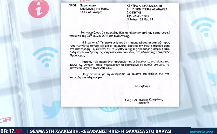 «Παρήλθαν δύο και πλέον έτη από την καταστροφική πυρκαγιά της 23ης Ιουλίου 2018 στο Μάτι Αττικής. Η Στρατιωτική Υπηρεσία εκτίμησε ότι η παρασχεθείσα βοήθεια προς τους πληγέντες υπήρξε εξαιρετικά σημαντική, ιδιαίτερα την πρώτη περίοδο μετά την καταστροφή […] Κατόπιν των παραπάνω αποφασίστηκε οι διαμένοντες στο μοτέλ του ΚΑΑΥ του Αγίου Ανδρέα να παραδώσουν τα οικήματα το αργότερο μέχρι τα Μέσα Απριλίου» αναφέρει το έγγραφο.