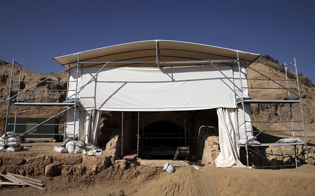 Επίσης, το υπουργείο Πολιτισμού πληροφορεί ότι ο πρώτος διαφραγματικός τοίχος, μετά την είσοδο, έχει αποκαλυφθεί μόνον ως το ιωνικό επιστύλιο, το οποίο διακοσμείται με τους οκτάφυλλους ανάγλυφους ρόδακες. Στο ακραίο ανατολικό τμήμα του επιστυλίου εμφανίστηκε το ανώτατο τμήμα πλευρικής παραστάδος. Επίσης, διαπιστώθηκε ότι λείπει το ακραίο δυτικό τμήμα του επιστυλίου, όπως και οι υπερκείμενοι αυτού λίθοι. «Όπως έχουμε ήδη αναφέρει- δελτίο της 25ης Αυγούστου-επί του διαφραγματικού τοίχου θα υπάρχει η είσοδος, η οποία θα οδηγεί στον δεύτερο χώρο του μνημείου. Η μορφή της εισόδου θα αποκαλυφθεί μετά την αφαίρεση των χωμάτων, κατά τις αμέσως επόμενες μέρες», αναφέρεται στην ανακοίνωση.