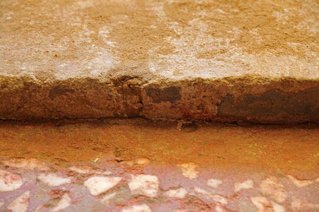Το τμήμα του δαπέδου αποκαλύφθηκε με την αφαίρεση χωμάτων από τον προθάλαμο, στον χώρο πίσω από τον τοίχο των Σφιγγών, ενώ στο κατώφλι του πρώτου διαφραγματικού τοίχου των Σφιγγών, εντοπίστηκαν επί της νωπογραφίας η οποία το κάλυπτε, ίχνη μπλε χρώματος.