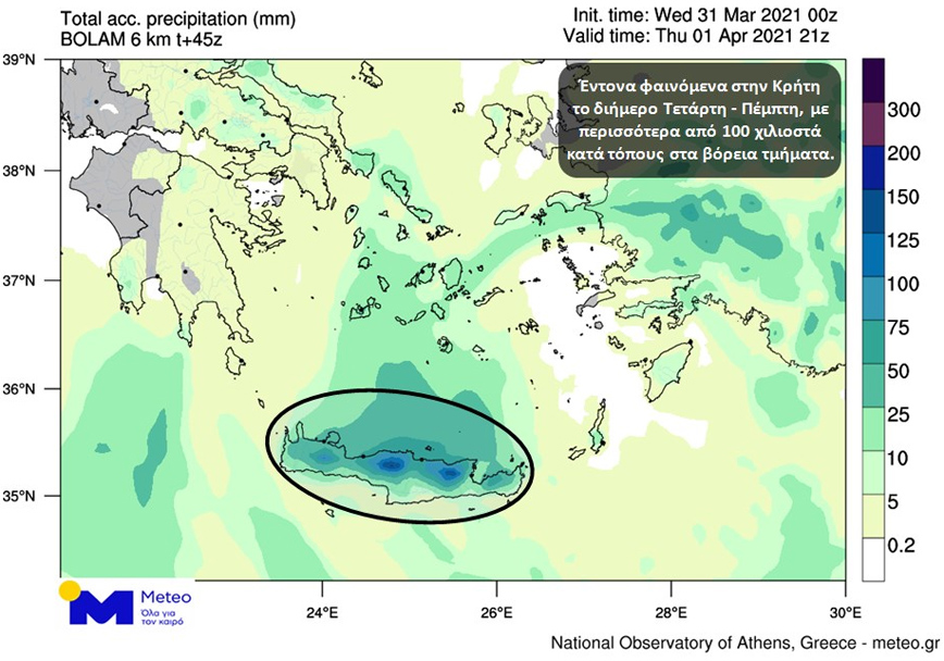 Σύμφωνα με τα προγνωστικά δεδομένα του Εθνικού Αστεροσκοπείου Αθηνών / meteo.gr περισσότερο αναμένεται να επηρεαστεί η Κρήτη όπου κατά τη διάρκεια της Τετάρτης 31/03 θα εκδηλωθούν ισχυρές βροχές και καταιγίδες στα πεδινά και πυκνές χιονοπτώσεις στα ορεινά.