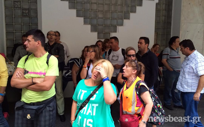 Οι συγκεντρωμένοι φωνάζουν συνθήματα κατά του αντιπροέδρου της κυβέρνησης, Ευάγγελου Βενιζέλου, ζητώντας την αποκατάσταση των εργασιών τους.