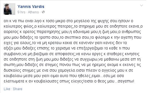 «Ήσουν ο καλύτερος φίλος, ο καλύτερος πατέρας, το στήριγμά μου σε οτιδήποτε έκανα, ο αόρατος και ορατός παρατηρητής μου, η αδυναμία μου, η ζωή μου, ο άνθρωπός μου» λέει στο Facebook ο γιος του Γιάννης, λίγες ώρες μετά το θάνατό του. «Είσαι πλέον ο άγγελός μου και σε κουβαλάω μέσα μου γιατί είμαι αυτό που ήθελες, είμαι εσύ. Είσαι ο Θεός μου… σ’ αγαπώ» προσθέτει στο συγκινητικό μήνυμά του.