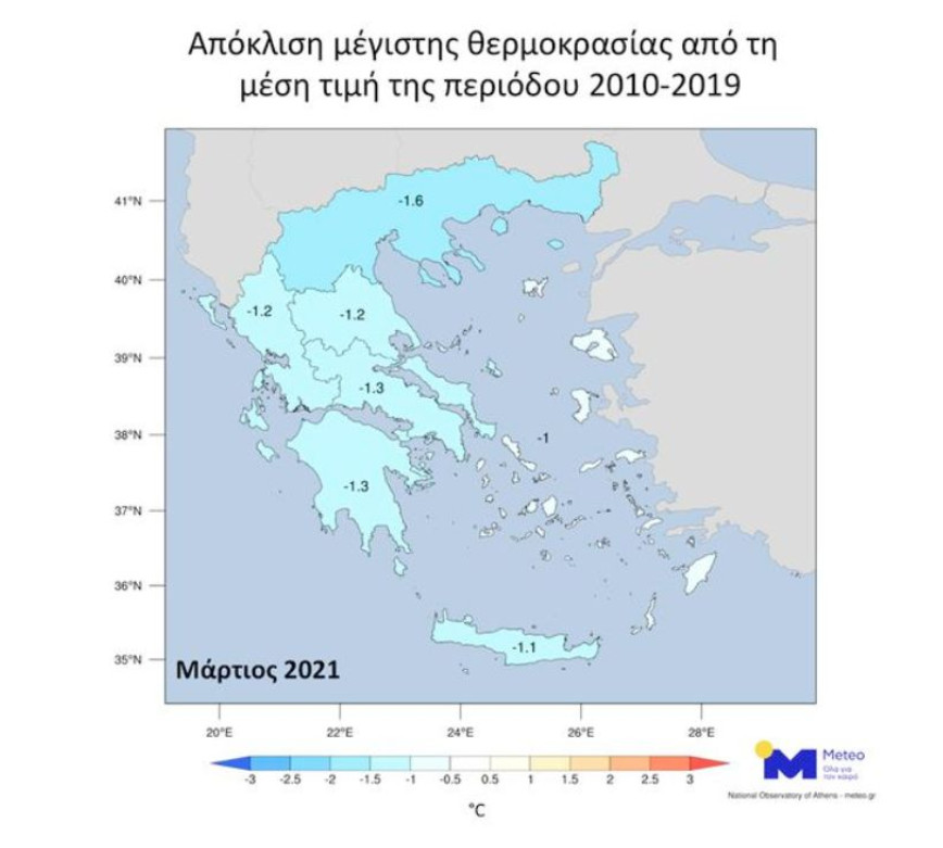 Από τους πιο κρύους των τελευταίων ετών υπήρξε ο Μάρτιος του 2021 στην Ελλάδα, καθώς η μέση τιμή των μεγίστων θερμοκρασιών τον περασμένο μήνα ήταν ανάμεσα στις τέσσερις χαμηλότερες της τελευταίας δεκαετίας.