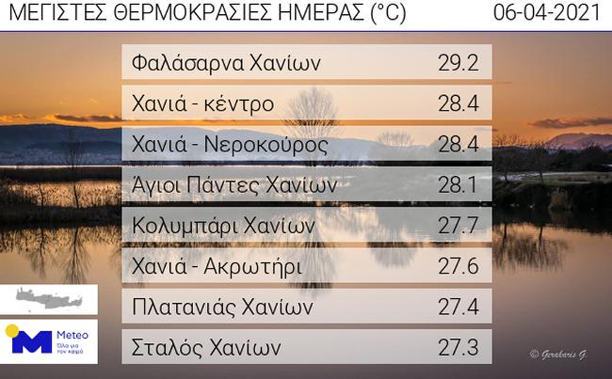 Οι εν λόγω άνεμοι λειτουργούν ως καταβάτες στις υπήνεμες πλευρές των ορεινών όγκων του νησιού, ανεβάζοντας κατά μερικούς βαθμούς τη θερμοκρασία. Χαρακτηριστική είναι η άνοδος της θερμοκρασίας στις βόρειες περιοχές της Κρήτης. Όπως προκύπτει από τον πίνακα που παρουσιάζει τις υψηλότερες θερμοκρασίες στο νησί έως το πρωί της Τρίτης 06/04, η υψηλότερη σημειώθηκε στα Φαλάσαρνα Χανίων όπου έφτασε τους 29.2 βαθμούς Κελσίου.