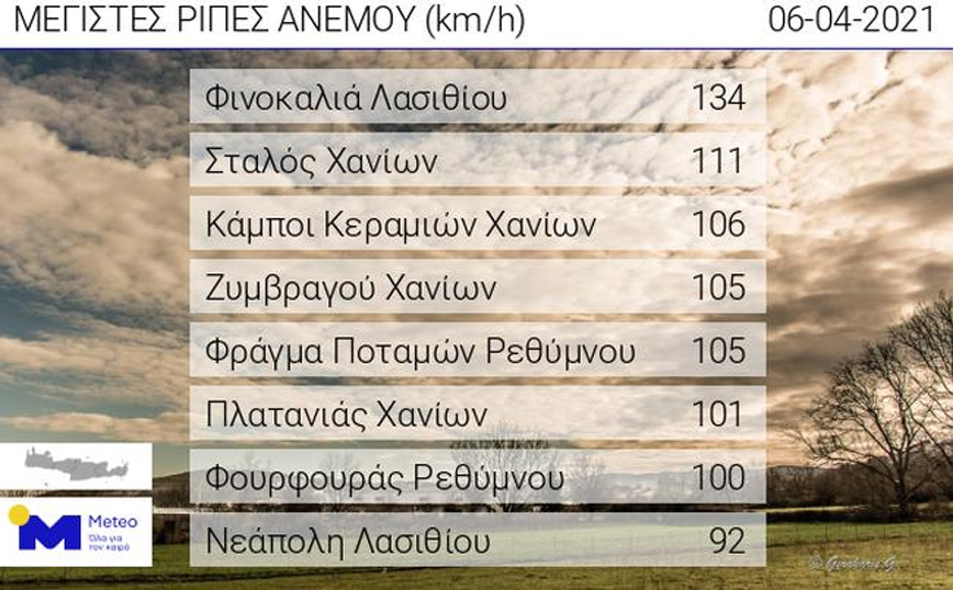 Στον πίνακα που ακολουθεί παρουσιάζονται οι 8 σταθμοί του δικτύου αυτόματων μετεωρολογικών σταθμών του Εθνικού Αστεροσκοπείου Αθηνών/meteo.gr στην Κρήτη που κατέγραψαν τις ισχυρότερες ριπές ανέμου έως το πρωί της Τρίτης 06/04. Όπως προκύπτει από αυτόν, η ισχυρότερη ριπή καταγράφηκε στη Φινοκαλιά Λασιθίου και ήταν ίση με 134 χλμ/ώρα.
