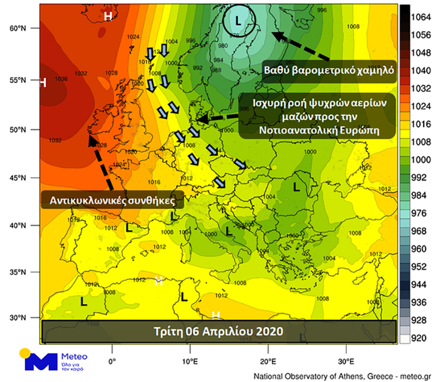 Η νέα ψυχρή εισβολή οφείλεται στον συνδυασμό ενός βαθύ χαμηλού στην περιοχή της Βόρειας Σκανδιναβίας και των έντονα αντικυκλωνικών συνθηκών δυτικά της Ιρλανδίας. Ο εν λόγω συνδυασμός έχει ως αποτέλεσμά την ενισχυμένη ροή ψυχρών αερίων μαζών προς τη Νοτιοανατολική Ευρώπη.