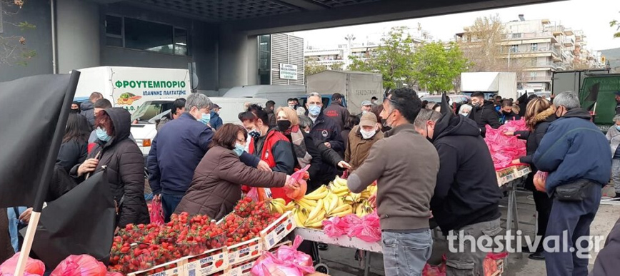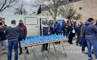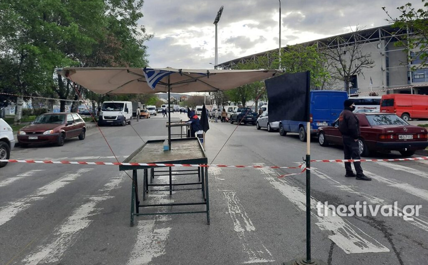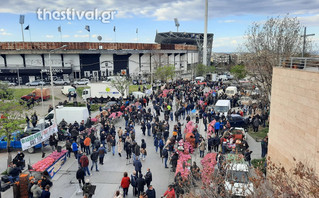 Στη Θεσσαλονίκη επαγγελματίες, παραγωγοί και πωλητής συγκεντρώθηκαν μπροστά από το γήπεδο της Τούμπας κρατώντας μαύρες σημαίες.