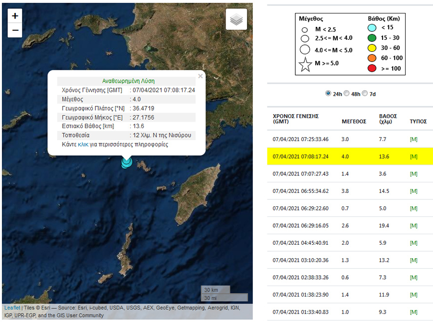 Σεισμική δόνηση, μεγέθους 4 βαθμών της κλίμακας Ρίχτερ, σημειώθηκε στις 10:08 ανοιχτά της Νισύρου.