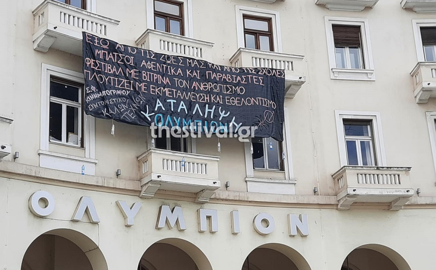 «Έξω από τις ζωές μας και από τις σχολές μπάτσοι, αφεντικά και παραβιαστές φεστιβάλ με βιτρίνα τον ανθρωπισμό. Πλουτίζει με εκμετάλλευση και εθελοντισμό», γράφει το πανό που ανήρτηθηκε στην πρόσοψη του κτιρίου.