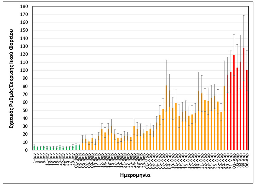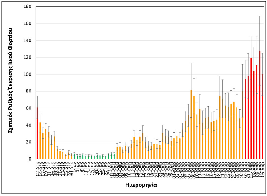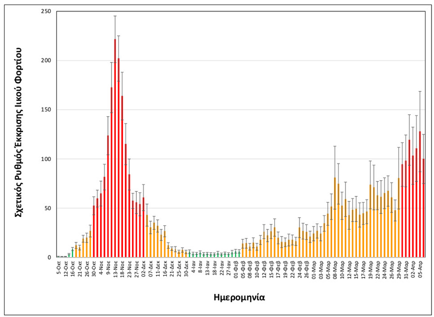 Όπως, εξάλλου, ανακοινώθηκε από τον ΕΟΔΥ, την εβδομάδα 29/3-4/4/2021 παρατηρήθηκε αύξηση (+56%) στον σχετικό ρυθμό έκκρισης του ιικού φορτίου, σε σχέση με την προηγούμενη εβδομάδα, 22-28/3/2021.