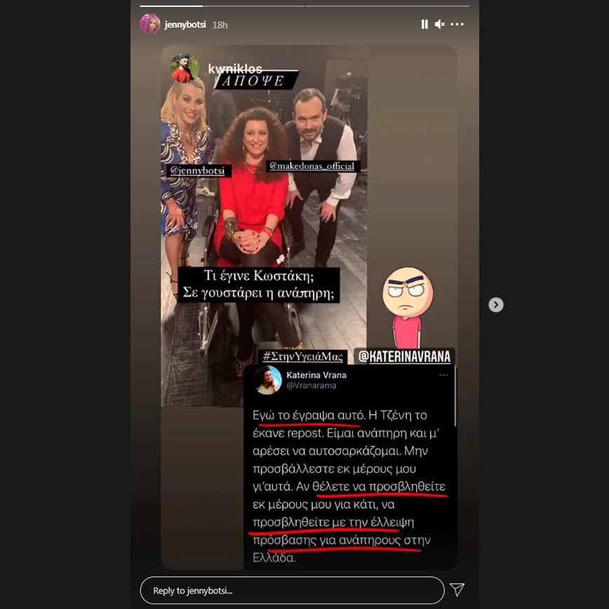 Η Κατερίνα Βρανά ξεκαθάρισε με νέα της ανάρτηση στα social media πως το σχόλιο είναι δικό της και της αρέσει να αυτοσαρκάζεται. «Εγώ το έγραψα αυτό. Η Τζένη το έκανε repost. Είμαι ανάπηρη και μ’ αρέσει να αυτοσαρκάζομαι. Μην προσβάλλεστε εκ μέρους μου γι’αυτά. Αν θέλετε να προσβληθείτε εκ μέρους μου για κάτι, να προσβληθείτε με την έλλειψη πρόσβασης για ανάπηρους στην Ελλάδα» έγραψε στην νέα της ανάρτηση.