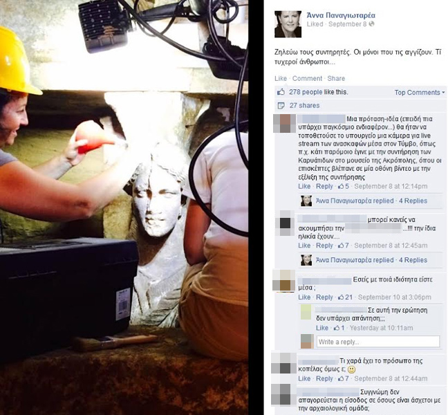 Η δημοσίευση αυτή προκάλεσε αρκετά ερωτηματικά σχετικά με το γιατί η κ. Παναγιωταρέα βρίσκεται στον εσωτερικό χώρο του τάφου της Αμφίπολης καθώς και για το πώς μια δημοσιογράφος εξασφαλίζει πρόσβαση σε αυτό το φωτογραφικό υλικό…