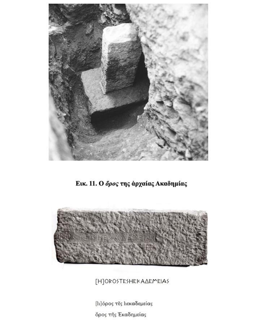 Σημαντικό τοπόσημο στην κυριολεξία αποτελεί η λίθινη στήλη του 500 π.Χ. με την επιγραφή «όρος της Ακαδήμειας», που βρέθηκε στη θέση της (κατά χώραν) σε σωστική ανασκαφή στην περιοχή και αποδεικνύει την ταύτιση του σημερινού κηρυγμένου αρχαιολογικού χώρου με την αρχαία Ακαδήμεια.