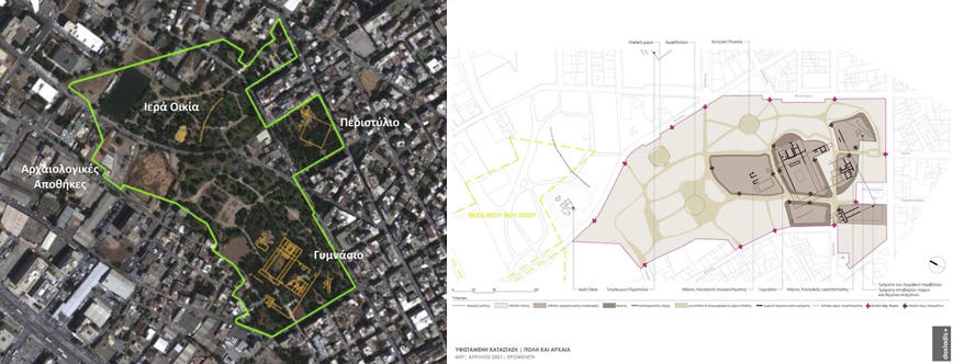 Οι δύο μελέτες αφορούν στο νότιο και ανατολικό τμήμα του αρχαιολογικού χώρου, που περιβάλλονται από τις οδούς Δράκοντος, Κρατύλου, Μοναστηρίου, Αλεξανδρείας, Πολυκράτους, Βασιλικών, Φάωνος και Διονύσου, έκτασης 60 περίπου στρεμμάτων (Τομέας Γυμνασίου) και Μοναστηρίου, Τριπόλεως, Πλάτωνος και Ευκλείδου αντίστοιχα, έκτασης 10 στρεμμάτων (Τομέας Περιστυλίου).