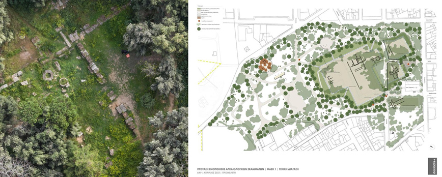 Στο επίπεδο των αρχαίων καταλοίπων προβλέπεται η ενοποίηση των επιμέρους σκαμμάτων με αποχωματώσεις, ανασκαφές, διαμόρφωση νέων πρανών με ήπια κλίση, γήινη μορφή και αποστράγγιση ομβρίων, καθώς και ταυτόχρονη απομάκρυνση δένδρων, όπου απαιτείται, τα οποία θα μεταφυτευθούν σε άλλα σημεία του πάρκου ή και θα φυτευθούν νέα άτομα, για να μη διασαλευθεί το υφιστάμενο ισοζύγιο πρασίνου στο πάρκο.