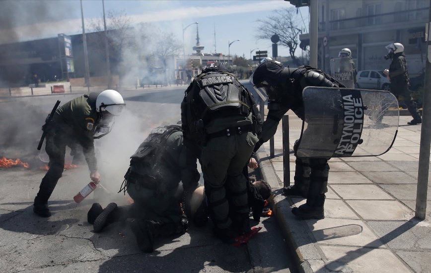 Στις φλόγες τυλίχθηκε ένας διαδηλωτής στη Θεσσαλονίκη από βόμβα μολότοφ, με τους αστυνομικούς να σβήνουν τη φωτιά. Τα επεισόδια σημειώθηκαν το μεσημέρι της Πέμπτης (15/4) μετά το πανεκπαιδευτικό συλλαλητήριο.