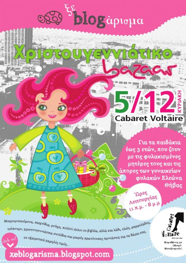 Όπως κάθε χρόνο, έτσι και φέτος το xeblogarisma.blogspot.com διοργανώνει και Χριστουγεννιάτικο bazaar για τα παιδιά κάτω των τριών ετών που ζουν με τις φυλακισμένες μητέρες τους και για τις άπορες των γυναικείων φυλακών Ελεώνα Θήβας.