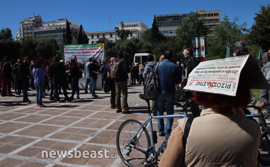 Η συγκέντρωση έγινε στην πλατεία Κλαυθμώνος, όπου πριν είχαν πραγματοποιήσει αντίστοιχη κινητοποίηση συνταξιούχοι της Αττικής (πλέον έχουν αποχωρήσει).