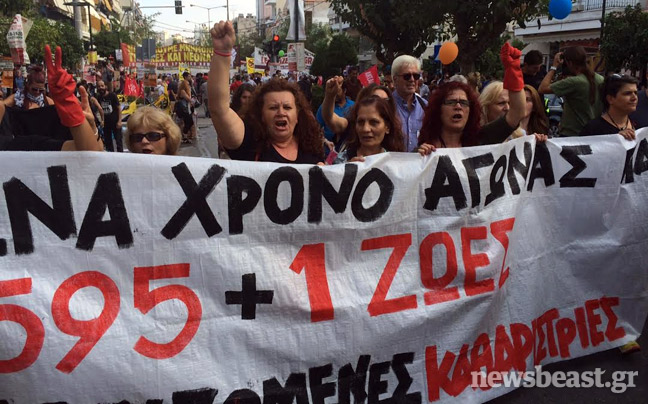 Στην πορεία βρίσκεται και αντιπροσωπεία από τις απολυμένες καθαρίστριες του ΥΠΟΙΚ, ενώ οι δρόμοι όπου διεξάγεται είναι κλειστοί.