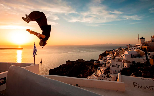 Η «Τέχνη της Φυγής», όπως είναι ευρέως γνωστό το freerunning, αναδεικνύεται μέσα από τα γραφικά καλντερίμια, τις καμπυλωτές ασβεστωμένες στέγες και τα στενά μονοπάτια της Καλντέρας που μεταμορφώνονται σε φυσικά εμπόδια τα οποία καλούνται να ξεπεράσουν οι αθλητές με όπλο τη φαντασία και τη δημιουργικότητά τους. Το αποτέλεσμα; Τολμηρά άλματα, tricks, αναρριχήσεις και drops δένουν μοναδικά στο απίθανο Κυκλαδίτικο σκηνικό.