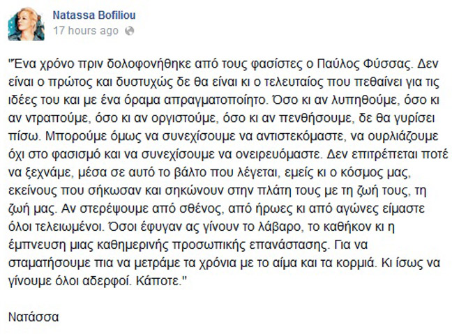 Το δικό της μήνυμα μέσω της προσωπικής της σελίδας στο facebook έστειλε η Νατάσσα Μποφίλιου με αφορμή τη συμπλήρωση ενός έτους από τη δολοφονία του Παύλου Φύσσα.