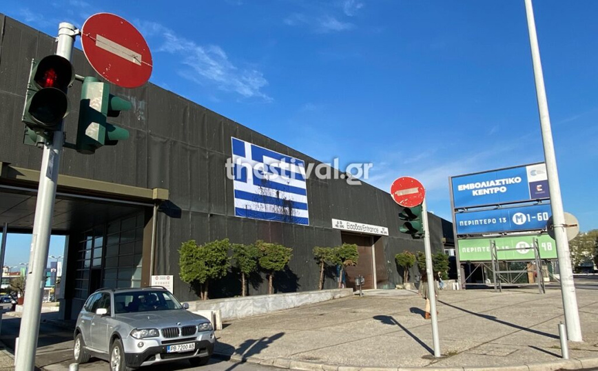 Η πελώρια ελληνική σημαία τοποθετήθηκε λίγες ημέρες πριν από την επέτειο της 25ης Μαρτίου στην πρόσοψη της πύλης της ΔΕΘ επί της οδού Εγνατία.