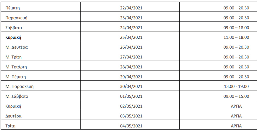 Ξεκινάει σήμερα Πέμπτη 22 Απριλίου το εορταστικό ωράριο των καταστημάτων για το Πάσχα, με τα μαγαζιά να κλείνουν σήμερα στις 20:30, δεδομένου ότι η απαγόρευση κυκλοφορίας ξεκινάει στις 21:00. Τα καταστήματα θα είναι ανοιχτά αυτή την Κυριακή 25 Απριλίου από τις 11:00 έως τις 18:00 σύμφωνα με την ανακοίνωση του Εμπορικού Συλλόγου Αθηνών (ΕΣΑ).