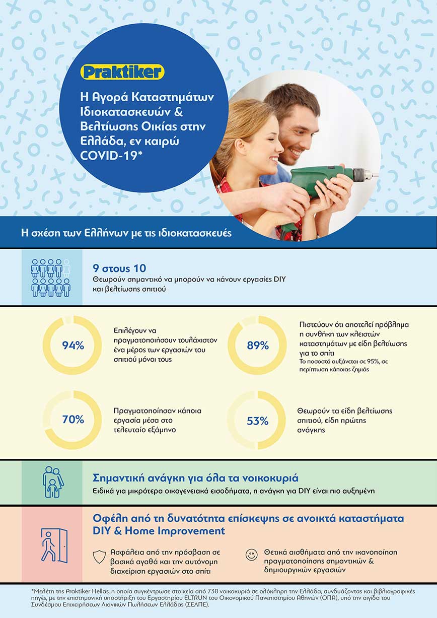 Με πρωτοβουλία της Praktiker Hellas, του Νo. 1 Ελληνικού Δικτύου καταστημάτων DIY και Home Improvement, την επιστημονική υποστήριξη του Εργαστηρίου ELTRUN του Οικονομικού Πανεπιστημίου Αθηνών (ΟΠΑ), υπό την αιγίδα του Συνδέσμου Επιχειρήσεων Λιανικών Πωλήσεων Ελλάδας (ΣΕΛΠΕ) πραγματοποιήθηκε μια ξεχωριστή μελέτη με τίτλο «Η Αγορά Καταστημάτων Ιδιοκατασκευών & Βελτίωσης Οικίας (DIY & Home Improvement) στην Ελλάδα και η Πανδημία COVID-19», η οποία είχε ως στόχο να διερευνήσει τη σχέση των καταναλωτών με τις ιδιοκατασκευές και τη σημασία που έχει στη ζωή τους. Τα ευρήματα της μελέτης παρουσιάζουν ιδιαίτερο ενδιαφέρον, καθώς αναδεικνύουν μεταξύ άλλων την υψηλή τάση και την ανάγκη των Ελλήνων για εργασίες DIY και οικιακής βελτίωσης και τη σημαντική θέση που κατέχουν πλέον στην καθημερινότητά τους τα είδη DIY και βελτίωσης σπιτιού. Παράλληλα, διαφαίνεται ότι η ασφάλεια που παρέχουν οι εν λόγω εργασίες, καθώς και η θετική επίδραση στην ψυχολογία, αποτελούν εξίσου σημαντικούς λόγους, παράλληλα με τις πρακτικές ανάγκες που καλύπτονται, για τους οποίους οι καταναλωτές στρέφονται ολοένα και περισσότερο σε αυτές τις ασχολίες, ενώ την ίδια στιγμή, από τη μελέτη προκύπτει η σημαντικότητα της συνθήκης ανοικτών καταστημάτων DIY και Home Improvement, ειδικά εν καιρώ lockdown.
