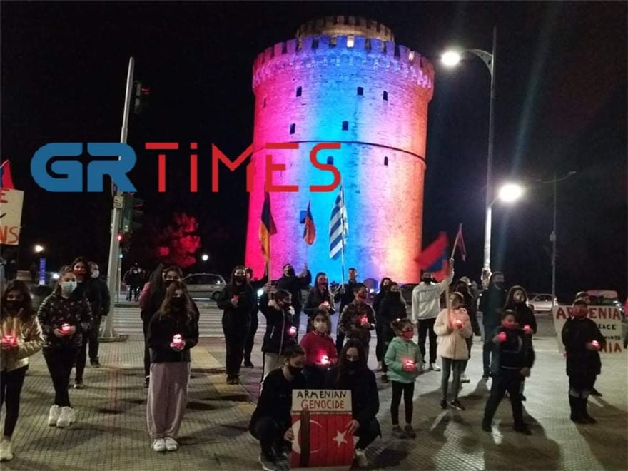 Σύμφωνα με το grtimes.gr περίπου 100 άτομα, ενήλικες αλλά και μικρά παιδιά, ανεμίζοντας τις σημαίες της Ελλάδας και της Αρμενίας, αποδίδουν φόρο τιμής στην ημέρα της Γενοκτονίας των Αρμενίων, υπό το φως του φωταγωγημένου μνημείου του Λευκού Πύργου.