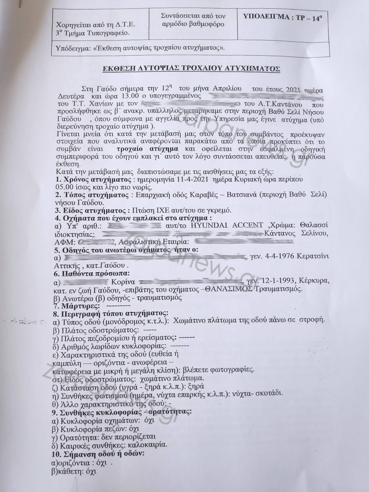 Ραγδαίες είναι οι εξελίξεις στην υπόθεση του τραγικού τροχαίου της Γαύδου, με τη νεαρή Κορίνα να χάνει τη ζωή της υπό αδιευκρίνιστες ακόμη συνθήκες