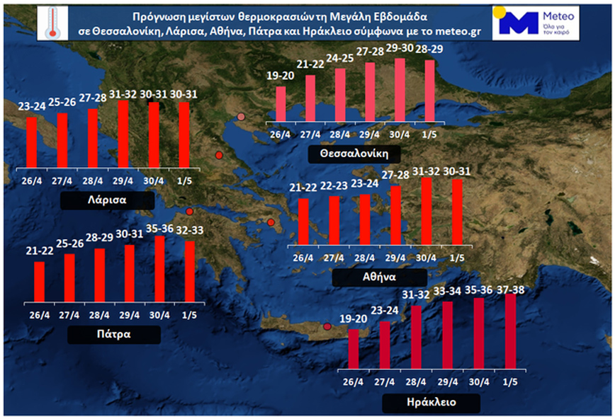 Το κυριότερο όμως χαρακτηριστικό του καιρού της Μεγάλης Εβδομάδας θα είναι η συνεχής σταδιακή άνοδος της θερμοκρασίας. Στην εικόνα που ακολουθεί παρουσιάζεται η μέγιστη θερμοκρασία που αναμένεται έως και το Μέγα Σάββατο (01/05) σε 5 επιλεγμένες πόλεις της χώρας. Όπως φαίνεται σε αυτή, σε αρκετές περιοχές η μέγιστη θερμοκρασία από την Μεγάλη Παρασκευή (30/4) κι έπειτα θα πλησιάσει ή ακόμη και θα ξεπεράσει τους 35 βαθμούς Κελσίου.