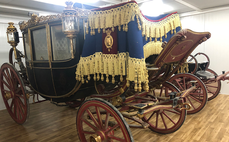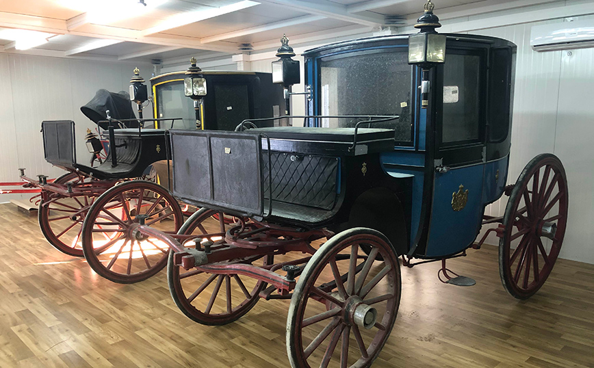 Η συλλογή -αναφέρεται στην ενημέρωση- περιλαμβάνει την επίσημη άμαξα τύπου Berlin που κατασκευάστηκε στη Γαλλία το 1870 για τον κόμη του Chambort και αγοράστηκε από τον Γεώργιο Α’ το 1871, ενώ χρησιμοποιήθηκε στον γάμο της βασίλισσας Σοφίας της Ισπανίας.