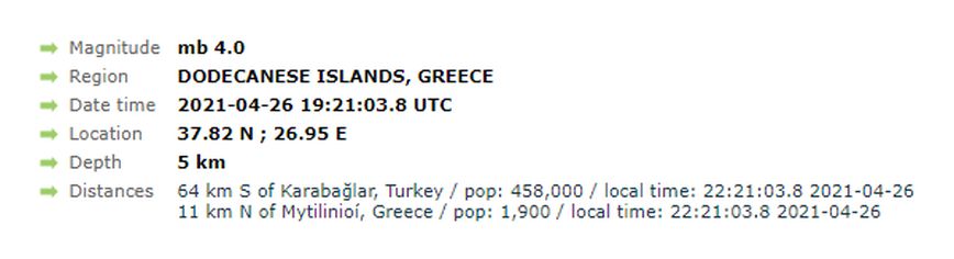 Σημειώνεται ότι τα δεδομένα για το σεισμό που προέρχονται από το Γεωδυναμικό Ινστιτούτο Αθηνών ή από το Ευρωμεσογειακό Σεισμολογικό Ινστιτούτο είναι λύσεις προερχόμενες από το αυτόματο υπολογιστικό σύστημα, χωρίς τη συμμετοχή σεισμολόγου. Ενημερώνονται συνεχώς με την άφιξη νέων δεδομένων.