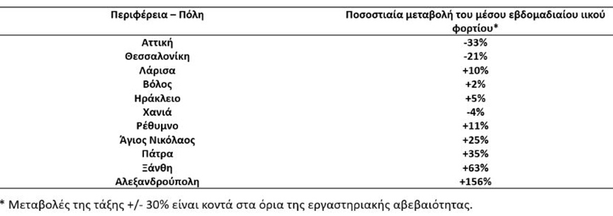 Οι οριακές μεταβολές σημειώνονται στη Θεσσαλονίκη (-21%), στο Ρέθυμνο (+11%) και στον Άγιο Νικόλαο (+25%), ενώ σταθερό παραμένει ουσιαστικά το φορτίο στις πόλεις των Χανίων, του Βόλου, του Ηρακλείου και της Λάρισας, όπου η μεταβολή του ιικού φορτίου στα λύματα κυμαίνεται από -4% έως +10%.