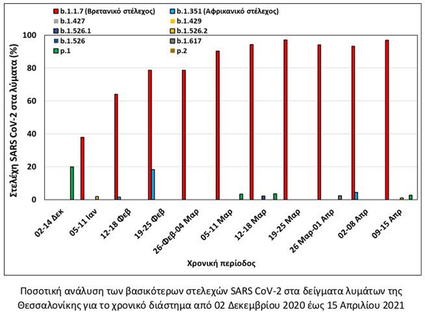 Οι αναλύσεις των δειγμάτων λυμάτων του πολεοδομικού συγκροτήματος της Θεσσαλονίκης, μέσω πρωτοποριακής -σε παγκόσμιο επίπεδο- μεθοδολογίας, που αναπτύχθηκε από τη σύμπραξη του Αριστοτελείου Πανεπιστημίου Θεσσαλονίκης (ΑΠΘ), της Εταιρείας Ύδρευσης Αποχέτευσης Θεσσαλονίκης (ΕΥΑΘ) και του Εθνικού Κέντρου Έρευνας και Τεχνολογικής Ανάπτυξης (ΕΚΕΤΑ), δείχνει σχεδόν καθολική επικράτηση του βρετανικού στελέχους του SARS-CoV-2 στη Θεσσαλονίκη μετά την πρώτη εβδομάδα του Μαρτίου.