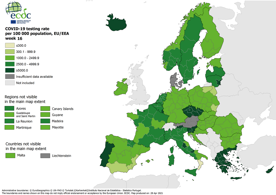 Στους χάρτες αποτυπώνεται, επίσης, ότι η Ελλάδα βρίσκεται στο κορυφαίο επίπεδο στην Ευρώπη όσον αφορά το testing, με περισσότερα από 5.000 τεστ ανά 100.000 κατοίκους.